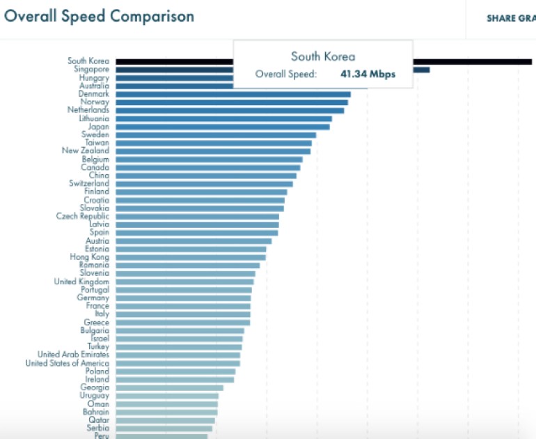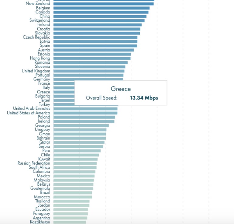 Κατά μέσο όρο η Ν. Κορέα έχει 41.34Mbps σύνδεση, ενώ το Αφγανιστάν, που είναι στο τέλος της λίστας, κατάφερε να φτάσει στα 2.2Mbps. Στις υπόλοιπες 4 θέσεις του top 5 βρίσκονται Σιγκαπούρη, Ουγγαρία Αυστραλία, Δανία. Η Ελλάδα έχει 13.34Mbps (33η θέση), οι ΗΠΑ 12.34Mbps και βρίσκονται κάτω από χώρες όπως Κίνα, Βουλγαρία, Ισραήλ και Τουρκία.