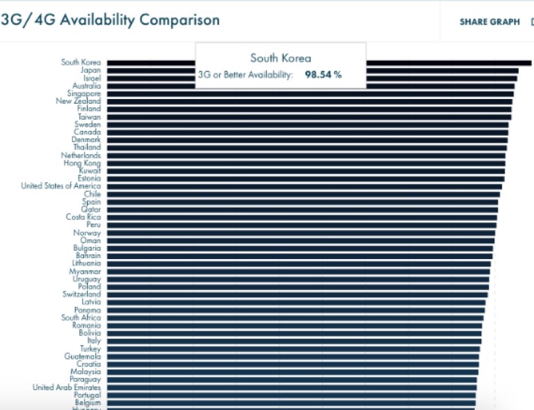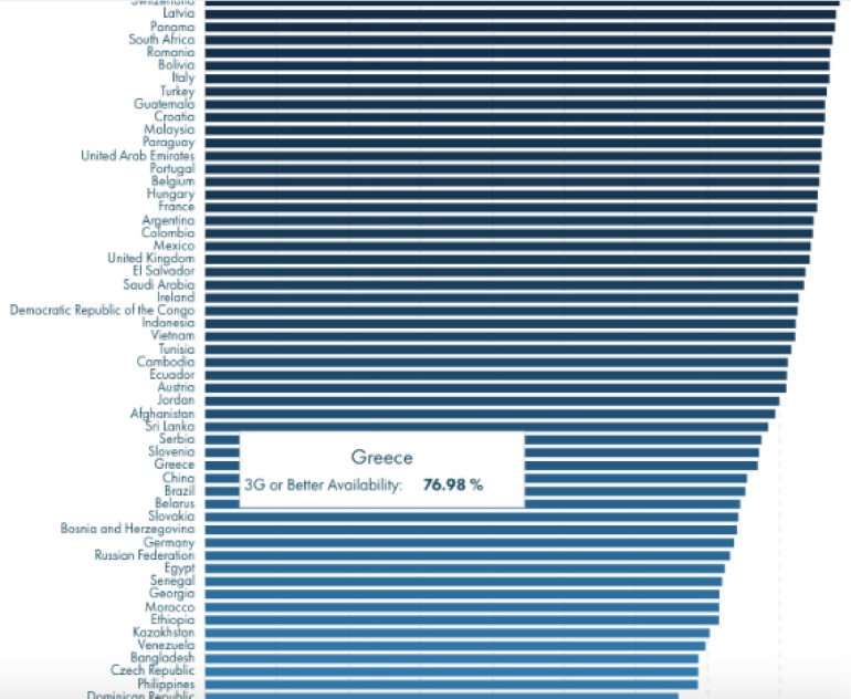 Όσο για την κάλυψη 3G ή καλύτερου δικτύου, πρώτη είναι και πάλι η Ν. Κορέα με κάλυψη 98.54% ενώ η Ελλάδα (67η) με 76.98%.
