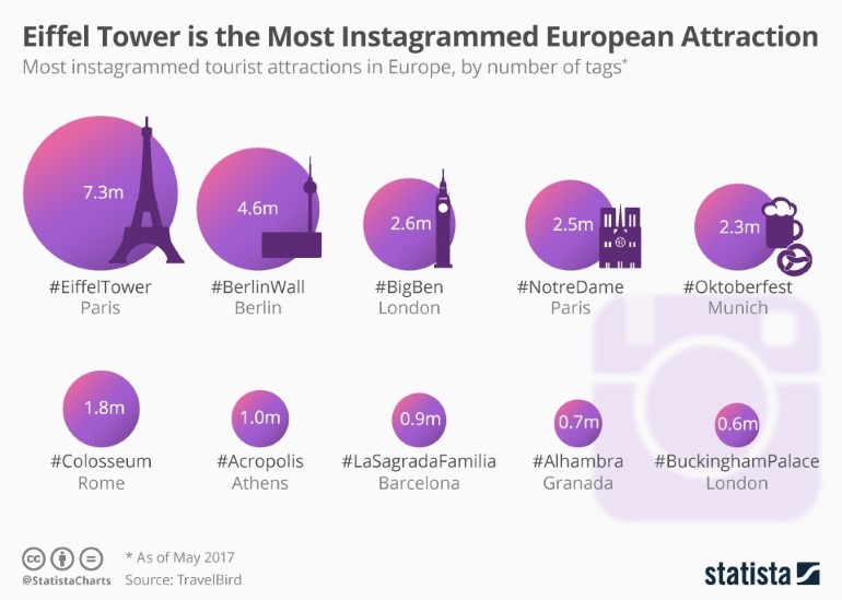 Το παρακάτω γράφημα της statista μας δείχνει τα πιο δημοφιλή ευρωπαϊκά μνημεία μεταξύ των χρηστών του Instagram, βάσει των σχετικών hashtags. Η Ακρόπολη βρίσκεται μέσα στη λίστα, της οποίας πάντως την πρώτη θέση καταλαμβάνει ο πύργος του Άιφελ στο Παρίσι.