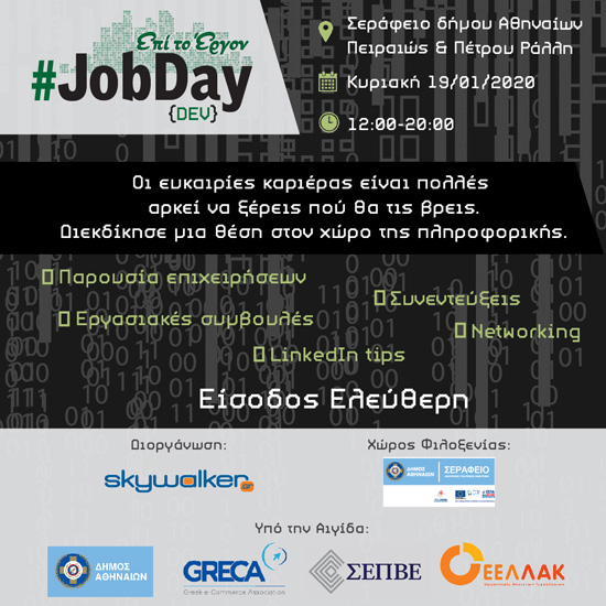 Βασικός σκοπός του #JobDay DEV, που πραγματοποιείται υπό την αιγίδα του δήμου Αθηναίων, του GRECA (Greek eCommerce Association), του ΣΕΠΒΕ (Σύνδεσμος Επιχειρήσεων Πληροφορικής Βορείου Ελλάδος) και του Οργανισμού Ανοιχτών Τεχνολογιών (ΕΕΛΛΑΚ) είναι η φυσική συνάντηση όσων αναζητούν το επόμενο βήμα στην καριέρα τους με τους μεγαλύτερους ιδιωτικούς οργανισμούς του κλάδου της πληροφορικής.
