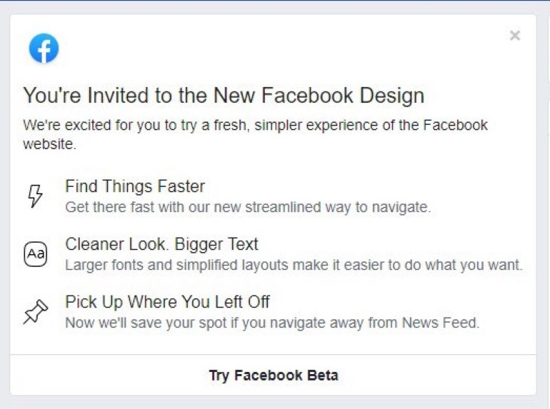 Τις τελευταίες ημέρες, όλο και περισσότεροι χρήστες αναφέρουν ότι το Facebook τους προσκαλεί να δουν το νέο σχεδιασμό. Αφού δεχτούν, τους δίνεται η επιλογή για φωτεινό ή σκοτεινό layout (dark mode). Η επιλογή είναι επίσης διαθέσιμη στις “γρήγορες ρυθμίσεις” στο δεξιά επάνω μέρος.