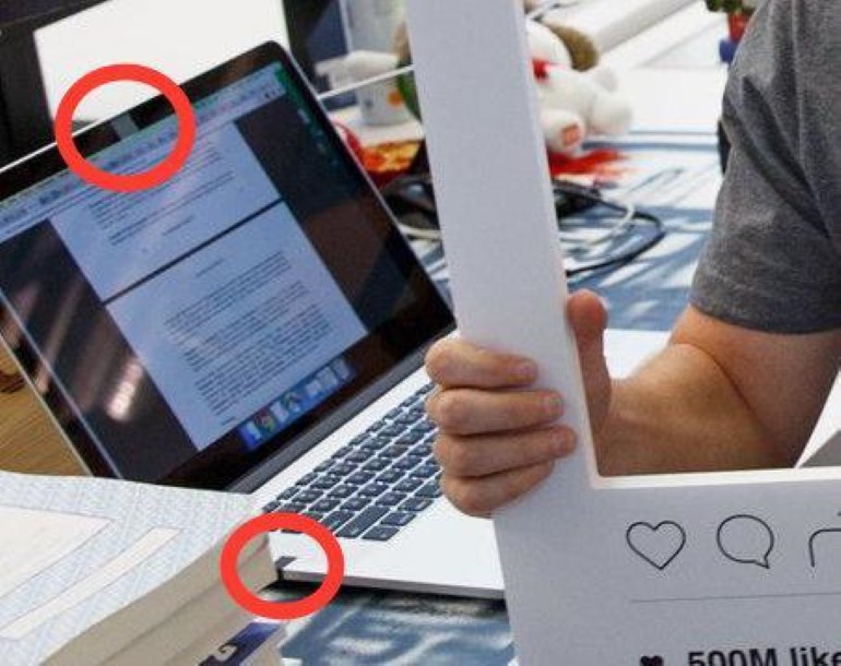Η φωτογραφία όμως δεν έχει κάνει το γύρο του διαδικτύου γι’ αυτό, αλλά για άλλο λόγο. Πίσω από τον ιδιοκτήτη του Facebook φαίνεται ένα γραφείο, το οποίο φαινόταν και σε ένα άλλο video, που είχε δημοσιεύσει ο ίδιος πριν μερικούς μήνες όπου έκανε μια περιήγηση στα γραφεία του Facebook. Επάνω σε αυτό το γραφείο (που πιστεύεται ότι είναι δικό του) υπάρχει ένα MacBook. Η κάμερα και το μικρόφωνο της συσκευής αυτής φαίνονται καλυμμένα με ταινία.