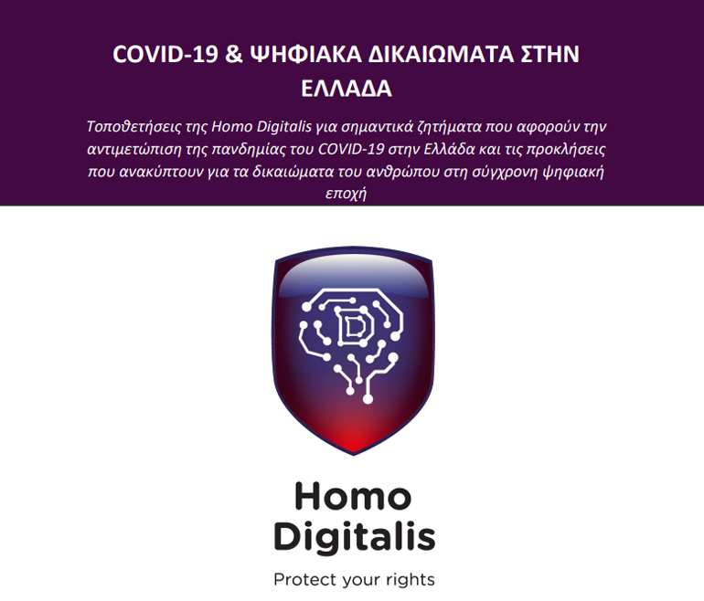 Η Homo Digitalis, η πρώτη Μη Κυβερνητική Οργάνωση στην Ελλάδα με αντικείμενο την προστασία των ανθρώπινων δικαιωμάτων στη ψηφιακή εποχή, δημοσίευσε τη θεματική της μελέτη με θέμα «COVID-19 & Ψηφιακά Δικαιώματα στην Ελλάδα».