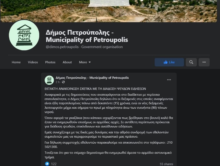 Τέτοια περίπτωση ακριβώς είναι η φωτιά στα Άνω Λιόσια, την οποία βλέπουν οι κάτοικοι της Πετρούπολης και θεωρούν ότι είναι στην περιοχή τους, αναμεταδίδοντας ότι υπάρχει φωτιά στην Πετρούπολη, κάτι που δεν ισχύει επί του παρόντος. Η επίσημη σελίδα του Δήμου Πετρουπόλεως έκανε νύξη στη φήμη που γίνεται όλο και πιο δημοφιλής για τις δεξαμενές της επίσης για να αποσαφηνίσει τα γεγονότα.