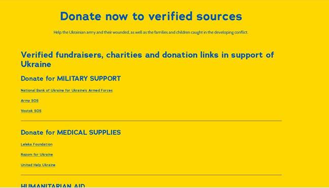 Ορισμένοι από τους ιστότοπους που αναφέρονται στο Darknet «δείχνουν» στην πραγματικότητα αξιόπιστους ιστότοπους. Αυτός που ξεχωρίζει είναι ο: https://www.defendukraine.org/donate- , ένας ιστότοπος που καλεί τους ανθρώπους να «Βοηθήσουν τον ουκρανικό στρατό και τους τραυματίες τους, καθώς και τις οικογένειες και τα παιδιά που έχουν παγιδευτεί στην σύγκρουση που είναι σε εξέλιξη». Αναφέρεται επίσης στον λογαριασμό Twitter «Defend Ukraine». Το domain καταχωρήθηκε στις 16 Φεβρουαρίου, μια εβδομάδα πριν ξεκινήσει ο πόλεμος στην Ουκρανία. Ο ίδιος ο ιστότοπος είναι απλός και περιέχει μια λίστα με διαφορετικούς οργανισμούς και ΜΚΟ στην Ουκρανία, καθώς και Crypto Currency – Bitcoin, Ethereum και USDT.