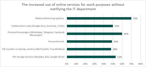 Ωστόσο, έρευνα σε 6.000 εργαζόμενους παγκοσμίως έδειξε ότι οι εργοδότες μπορεί να μην εξηγούν στους υπαλλήλους τους πώς να αποφύγουν να πέσουν θύματα ψηφιακών εγκληματιών. Τουλάχιστον το 73% των ερωτηθέντων δήλωσε ότι δεν τους δόθηκε εκπαίδευση ευαισθητοποίησης σχετικά με την ασφάλεια στον κυβερνοχώρο όταν άρχισαν να εργάζονται εξ αποστάσεως. Επιπλέον, περισσότερο από το ένα τέταρτο (27%) των ερωτηθέντων υπαλλήλων έχουν ήδη λάβει, για παράδειγμα, phising email σχετικά με τον COVID-19. Η τυχαία λήψη κακόβουλου περιεχομένου από ένα τέτοιο email μπορεί να οδηγήσει σε «μολύνσεις» συσκευών και σε κίνδυνο επιχειρηματικών δεδομένων. Πολλοί υπάλληλοι έχουν επίσης αυξήσει τη χρήση διαδικτυακών υπηρεσιών για εργασία που δεν έχουν εγκριθεί από τα τμήματα πληροφορικής τους, γνωστά ως shadow IT, όπως video conferencing (70%), instant messenger (60%) ή υπηρεσίες αποθήκευσης αρχείων (53%).