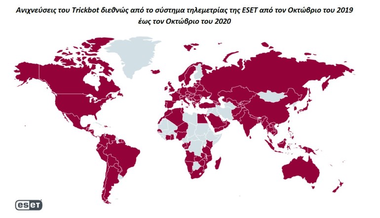 Η ESET Research παρακολουθεί τις δραστηριότητές του από τότε που ανιχνεύθηκε για πρώτη φορά, στα τέλη του 2016. Μόνο το 2020, η πλατφόρμα παρακολούθησης botnet της ESET ανέλυσε περισσότερα από 125.000 κακόβουλα δείγματα και κατέβασε και αποκρυπτογράφησε περισσότερα από 40.000 αρχεία διαμόρφωσης που χρησιμοποιήθηκαν από τα διάφορα Trickbot modules, αποκτώντας μια ολοκληρωμένη εικόνα για τους διαφορετικούς διακομιστές C&C που χρησιμοποιούνται από αυτό το botnet.