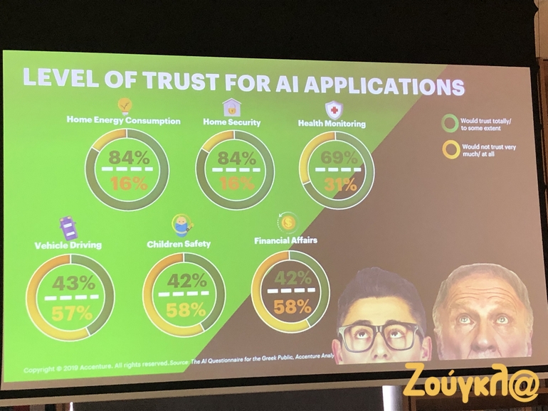 Ως αποτέλεσμα αυτού του παραδόξου, οι Έλληνες ενώ θα εμπιστευόντουσαν τις τεχνολογίες ΑΙ για εφαρμογές Οικιακής Κατανάλωσης Ενέργειας (84%), Οικιακής Ασφάλειας (84%) και Παρακολούθησης Υγείας (69%), είναι δύσπιστοι σε ότι αφορά εφαρμογές για τη Διαχείριση Οικονομικών (58%), την Ασφάλεια Παιδιών (58%) και την Αυτόνομη Οδήγηση (57%). Ανεξάρτητα από τις εφαρμογές, ένα ποσοστό 64% δηλώνει ότι δε θα εμπιστεύονταν πλήρωςτις τεχνολογίες ΑΙ, χωρίς τη δυνατότητα ελέγχου και παρέμβασης από ανθρώπους.