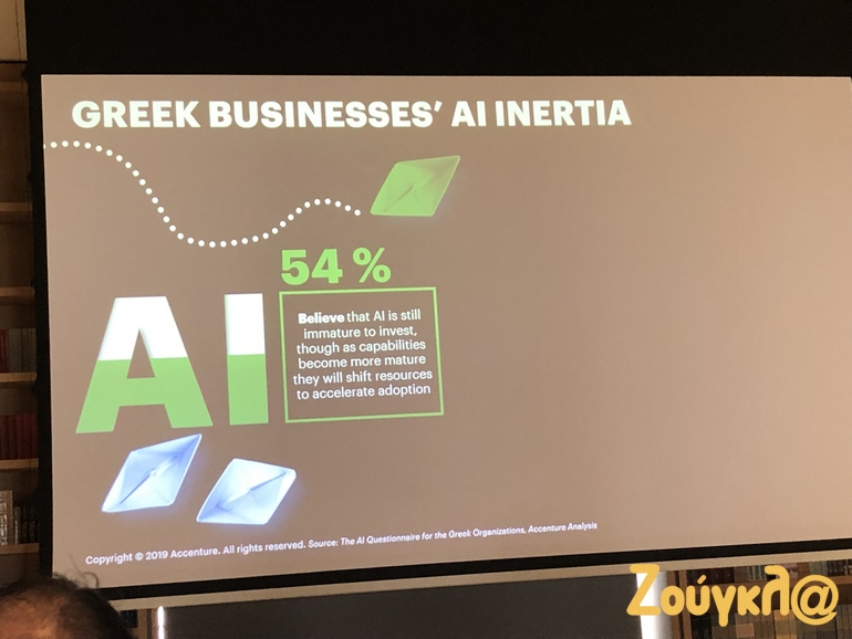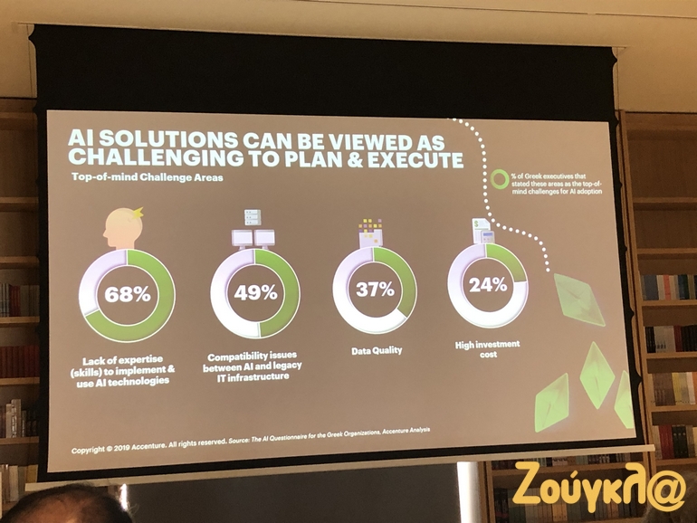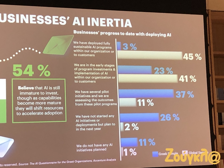 Ωστόσο, ελπιδοφόρο είναι το γεγονός ότι 23% των επιχειρήσεων βρίσκεται σε αρχικά στάδια επενδύσεων επάνω στο ΑΙ, ενώ 37% πειραματίζεται με διάφορες πιλοτικές εφαρμογές. Οι τρεις βασικότεροι λόγοι που εξηγούν την αδράνεια των επιχειρήσεων, σύμφωνα με τις απόψεις των στελεχών, είναι η έλλειψη ΑΙ δεξιοτήτων (69%), η ασυμβατότητα με τα παραδοσιακά-legacy συστήματα των επιχειρήσεων (57%) καθώς και η ποιότητα των δεδομένων (37%).