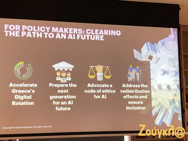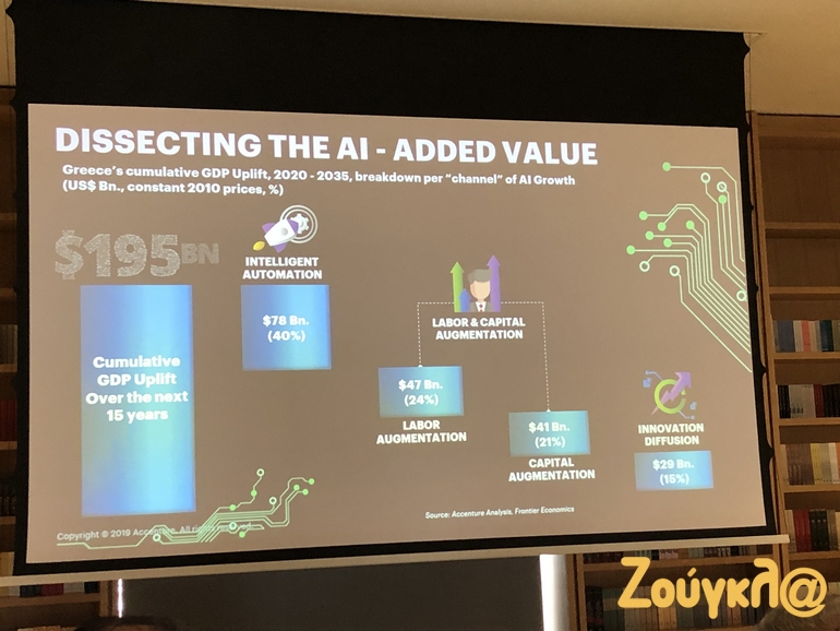 Η ανάλυση της Accenture δείχνει ότι η Τεχνητή Νοημοσύνη μπορεί να λειτουργήσει ως μοχλός ανάπτυξης για την Ελλάδα, καθώς διαπιστώνεται ότι έχει τη δυνατότητα να οδηγήσει σωρευτικά σε άνοδο του ΑΕΠ κατά 195 δισεκατομμύρια δολάρια, στα επόμενα 15 χρόνια (από το 2020 έως και το 2035).