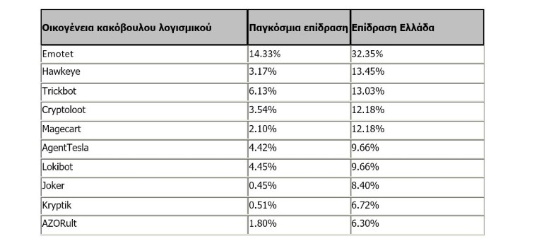 Η πλήρης λίστα με τις 10 πιο διαδεδομένες απειλές κακόβουλου λογισμικού στην Ελλάδα για τον Οκτώβριο είναι: