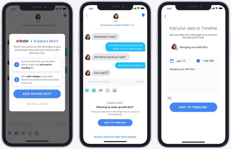 Το σημαντικότερο από τα νέα στοιχεία είναι το Noonlight, μια πλατφόρμα ασφαλείας που υπάρχει από το 2013 και θα ενσωματωθεί στο Tinder. Μέσω αυτής, θα μπορεί κάποιος να μοιραστεί πληροφορίες για το επερχόμενο ραντεβού του μέσω του Noonlight Timeline, όπως για παράδειγμα ποιον θα συναντήσει και πού.