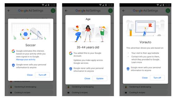 Για παράδειγμα, αν μας έχετε δηλώσει την ηλικία σας, μπορούμε να διασφαλίσουμε ότι οι διαφημίσεις που βλέπετε είναι σχετικές μ’ αυτήν. Με το νέο Ad Settings μπορείτε εύκολα να επικαιροποιήσετε ή να διορθώσετε τα προσωπικά στοιχεία σας στο Google Account. Εάν παρακολουθήσατε στιγμιότυπα από έναν πρόσφατο αγώνα ποδοσφαίρου στο Youtube ή αναζητήσατε ” ποδοσφαιρικά γήπεδα κοντά μου” στο Google Search, είναι πιθανό να δείτε μια διαφήμιση για ρούχα ποδοσφαίρου. Τέλος, αν επισκεφθείτε τον ιστότοπο μιας από τις αγαπημένες μάρκες σας, μπορεί να δείτε μια διαφήμισή της.