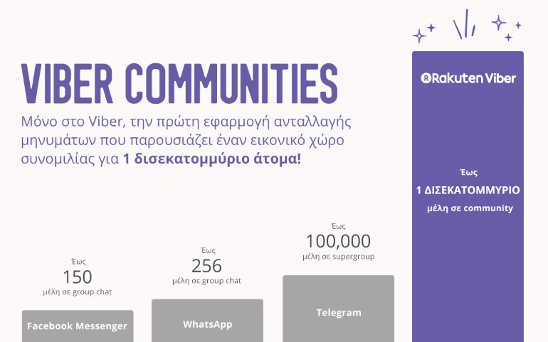 Το Viber, μία από τις κορυφαίες εφαρμογές ανταλλαγής μηνυμάτων παγκοσμίως, ανακοινώνει σήμερα την έναρξη των Viber Communities και γίνεται η πρώτη εφαρμογή ανταλλαγής μηνυμάτων που προσφέρει τη δυνατότητα δημιουργίας ενός εικονικού χώρου ομαδικής συνομιλίας όπου έως και 1 δισεκατομμύριο χρήστες μπορούν να ανταλλάσσουν μηνύματα και περιεχόμενο κάθε μορφής. Σήμερα στην αγορά οι ομαδικές συνομιλίες περιορίζονται σε εκατοντάδες ή χιλιάδες μέλη, ωστόσο το Viber ξεπερνά κατά πολύ αυτό το όριο και δίνει στους χρήστες τη μοναδική δυνατότητα να συνδέονται σε παγκόσμιες κοινότητες τεράστιας κλίμακας που δεν έχουμε ξαναδεί στο παρελθόν στον κλάδο εφαρμογών ανταλλαγής μηνυμάτων – έως και 1 δισεκατομμύριο χρήστες σε μία ομαδική συνομιλία.