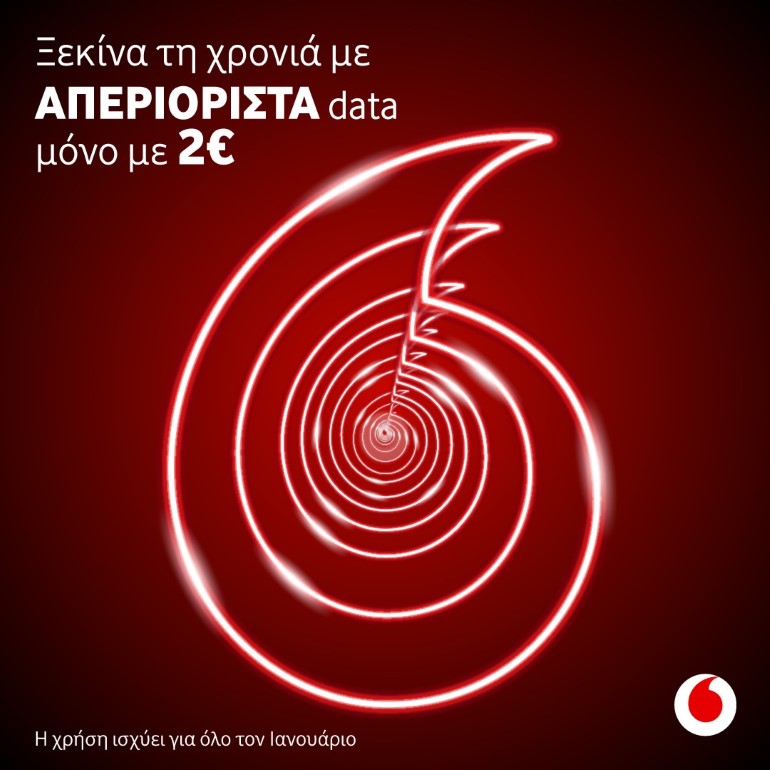 Η Vodafone Ελλάδας καλωσορίζει το 2020 και προσφέρει σε όλους τους πελάτες κινητής απεριόριστα data για ολόκληρο τον Ιανουάριο με μόλις 2 ευρώ.