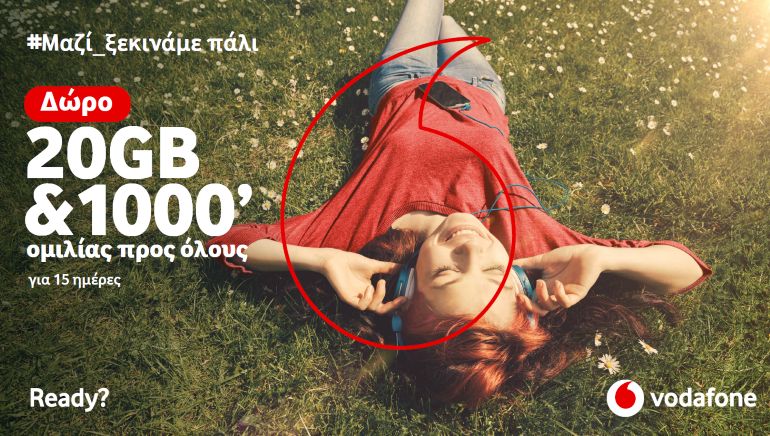 Με το μήνυμα #μαζί_ξεκινάμε πάλι, η Vodafone Ελλάδας συνεχίζει να στέκεται δίπλα στους πελάτες της και προσφέρει δωρεάν 20GB και 1000 λεπτά ομιλίας προς όλους, για να μοιραστούν τις στιγμές που περιμένουν, καλωσορίζοντας έτσι την επόμενη ημέρα της σταδιακής άρσης των μέτρων περιορισμού της κυκλοφορίας, με περισσότερη επικοινωνία.