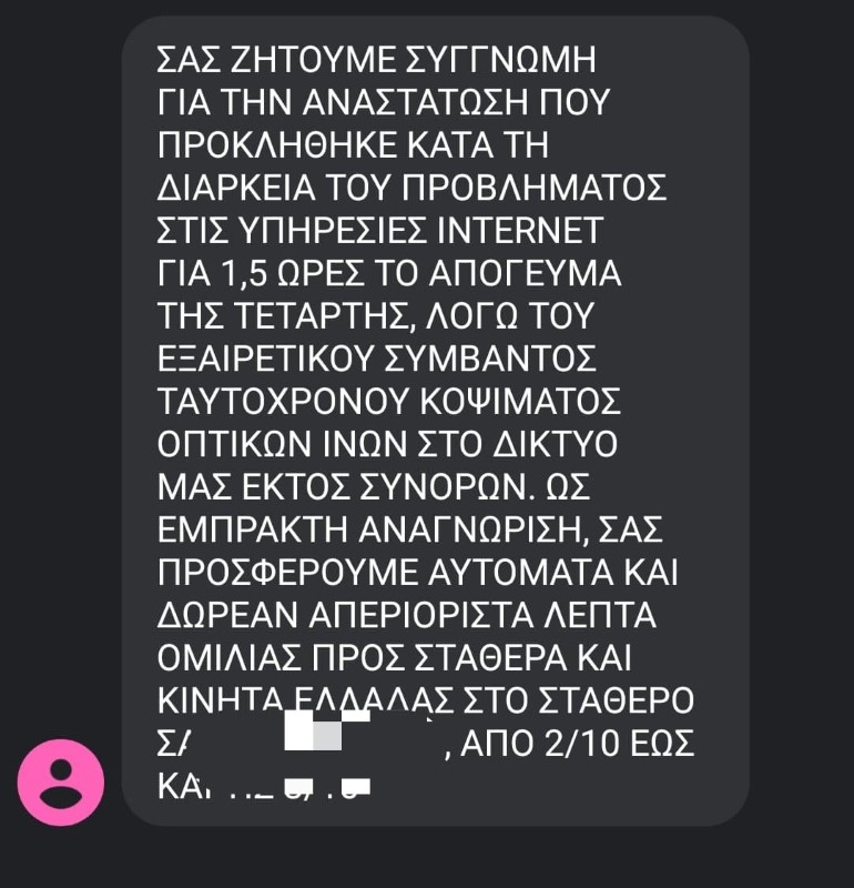“Σας ζητούμε συγγνώμη για την αναστάτωση που προκλήθηκε κατά τη διάρκεια του προβλήματος στις υπηρεσίες internet για 1,5 ώρες το απόγευμα της Τετάρτης, λόγω του εξαιρετικού συμβάντος ταυτόχρονου κοψίματος οπτικών ινών στο δίκτυό μας εκτός συνόρων. Ως έμπρακτη αναγνώριση, σας προσφέρουμε αυτόματα και δωρεάν απεριόριστα λεπτά ομιλίας προς σταθερά και κινητά Ελλάδας από 2/10 έως και τις 8/10.”