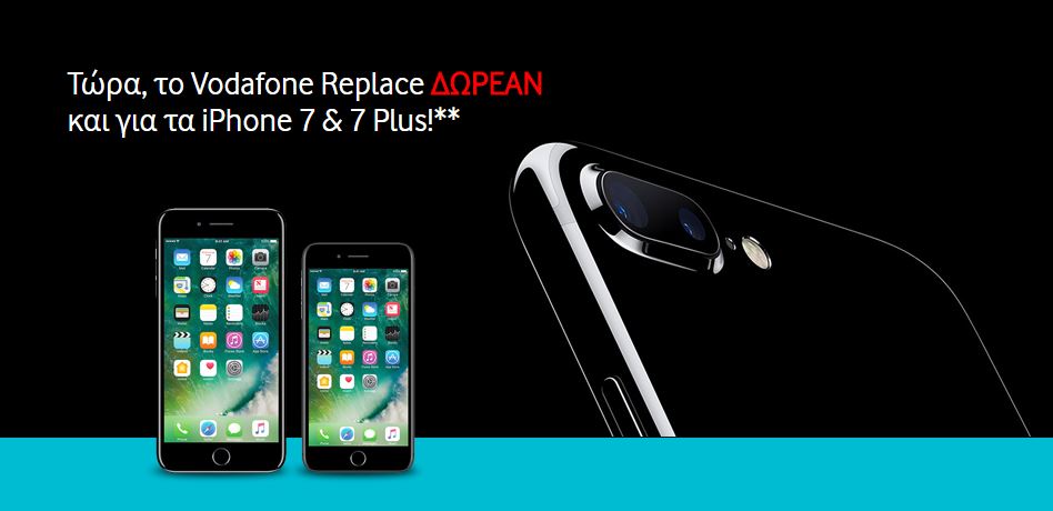 Το Vodafone Replace διατίθεται και για τα iPhone 7 και 7 Plus, ενώ η προσφορά ισχύει για αγορά σκέτης συσκευής ή σε πρόγραμμα Vodafone και έως 30/11/16.