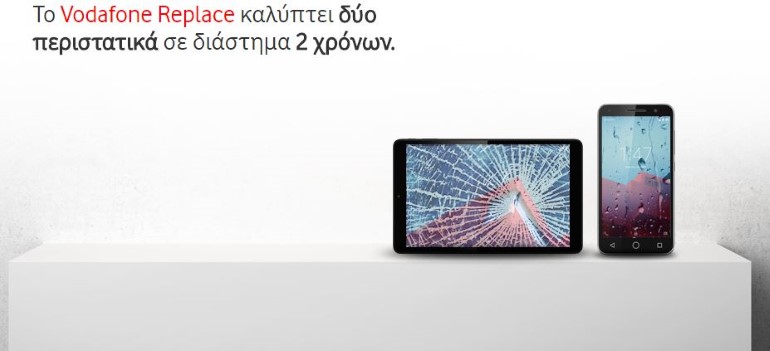 Το Vodafone Replace σας επιτρέπει να είστε ξέγνοιαστοι, αφού για δύο χρόνια, με κάθε νέα αγορά, Vodafone Smartphone ή Tablet, σας ασφαλίζει εντελώς ΔΩΡΕΑΝ και σας δίνει τη δυνατότητα να το αντικαταστήσετε με ίδιου τύπου εντός 24 ωρών.