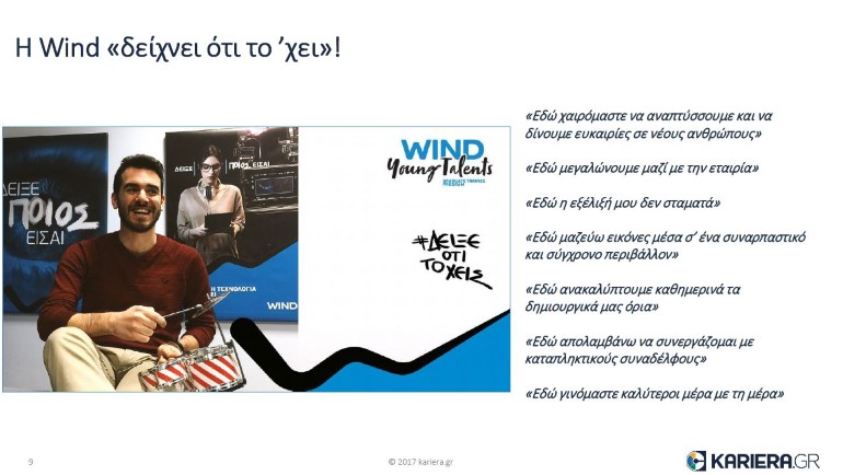 Δέκα νέους που θα ξεχωρίσουν για το ταλέντο, την προσωπικότητα, τη δημιουργικότητα και το πάθος τους αναζητά να εντάξει μόνιμα στο δυναμικό της η WIND Ελλάς μέσα από την πρωτοβουλία WIND Young Talents – Graduate Trainee Program. Η κατάθεση αιτήσεων ενδιαφέροντος είναι ανοιχτή έως και τις 7 Μαΐου 2017 στο www.windyoungtalents.gr
