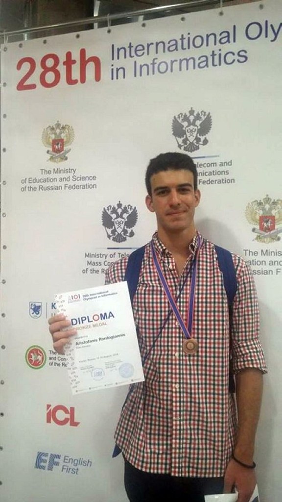 Συγκεκριμένα, ο μαθητής Ροντογιάννης Αριστοφάνης από το Κολλέγιο Αθηνών κατέκτησε το Χάλκινο Μετάλλιο μαζί με την Εθνική ομάδα Πληροφορικής που αποτελείται από τους εξαίρετους μαθητές: Κετσετσίδης Ραφαήλ (Εκπαιδευτήρια Μαντουλίδη), Μιχαλαϊνας Εμμανουήλ (2ο Πρότυπο Πειραματικό ΓΕΛ Θεσσαλονίκης) και Αγιάννης Κωνσταντίνος (10ο ΓΕΛ Λάρισας).