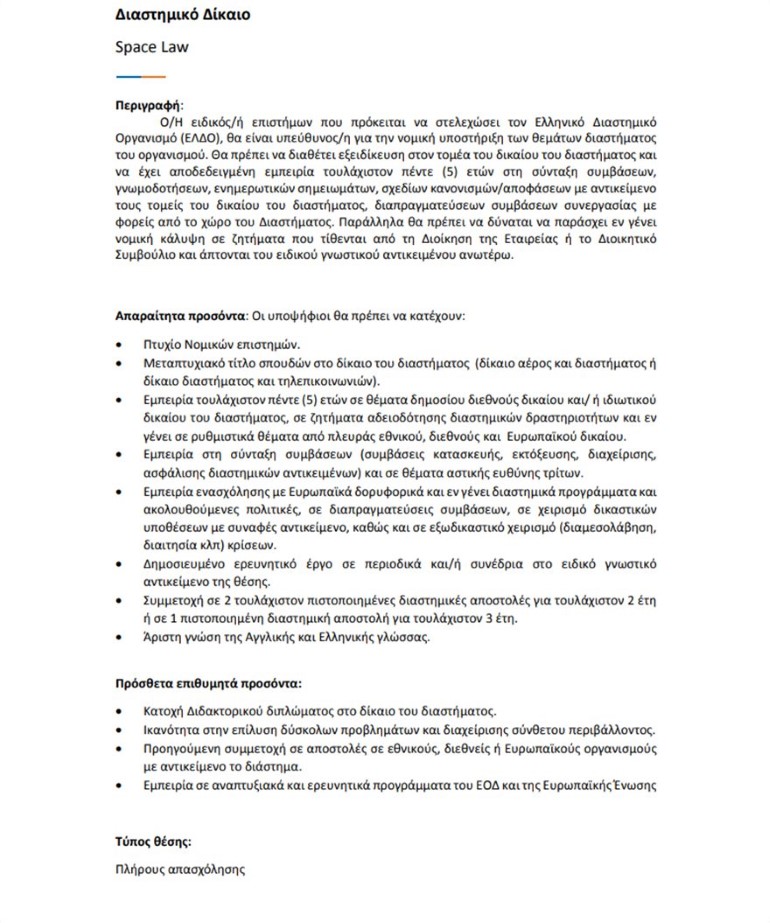 Μία από αυτές τις ειδικότητες ξεχωρίζει, καθώς αφορά σε ειδικό-επιστήμονα που θα είναι υπεύθυνος για τη νομική υποστήριξη των θεμάτων διαστήματος του οργανισμού. Απαιτείται εξειδίκευση στον τομέα του δικαίου του διαστήματος και… ανάμεσα σε άλλα, εμπειρία συμμετοχής σε 2 τουλάχιστον πιστοποιημένες διαστημικές αποστολές για τουλάχιστον 2 έτη ή σε 1 πιστοποιημένη διαστημική αποστολή για τουλάχιστον 3 έτη.