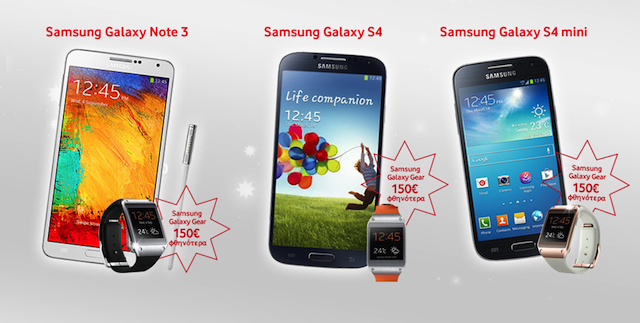 Έως και τις 31 Δεκεμβρίου, με κάθε αγορά των Smartphones Samsung Galaxy Note 3, Samsung Galaxy S4 και Samsung Galaxy S4 mini, οι πελάτες της Vodafone μπορούν να αγοράσουν και το Samsung Galaxy Gear 150 ευρώ φθηνότερα από την αρχική τιμή του.