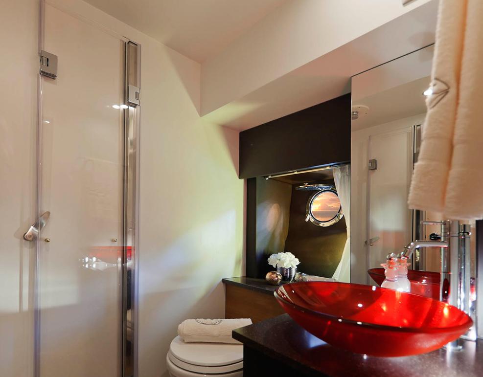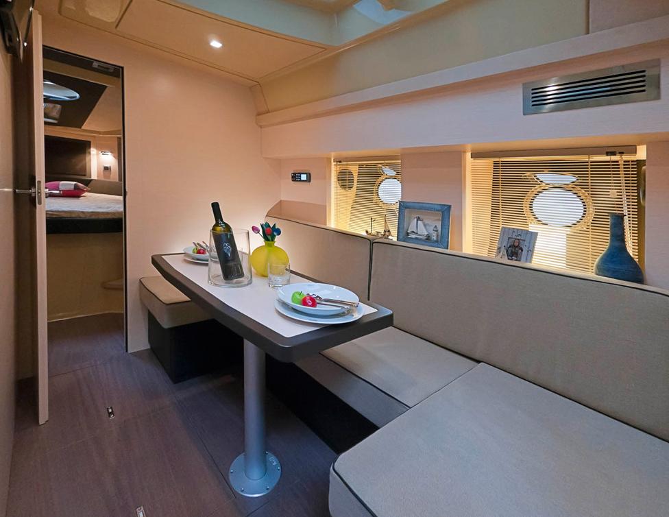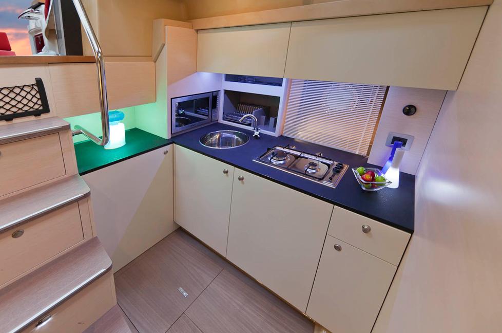 Στο εσωτερικό, βρίσκεται η κουζίνα, μια μικρή τραπεζαρία, ένα μπάνιο και δύο καμπίνες που μπορούν να φιλοξενήσουν έως πέντε άτομα. Ο συνδυασμός χρωμάτων είναι και εδώ πλούσιος, με το πάγκο της κουζίνας να είναι σε μπλε χρώμα, ο νεροχύτης σε κόκκινο και οι υπόλοιπες επιφάνειες σε λευκό και μπεζ.