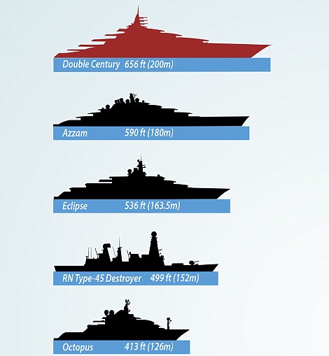Ονομάζεται «Διπλός Αιώνας» και στοχεύει να υποσκιάσει όλα τα υπόλοιπα πολυτελή γιοτ. Τον εν λόγω σκάφος-γίγας παρουσιάστηκε για πρώτη φορά την Τετάρτη: Έχει συνολικά εννέα καταστρώματα, δύο ελικοδρόμια, ύψος 26 μέτρα από τη στάθμη της θάλασσας, και εκτείνεται στα 200 μέτρα (σ.σ.: περίπου δυο φορές το μήκος ενός γήπεδου ποδοσφαίρου).