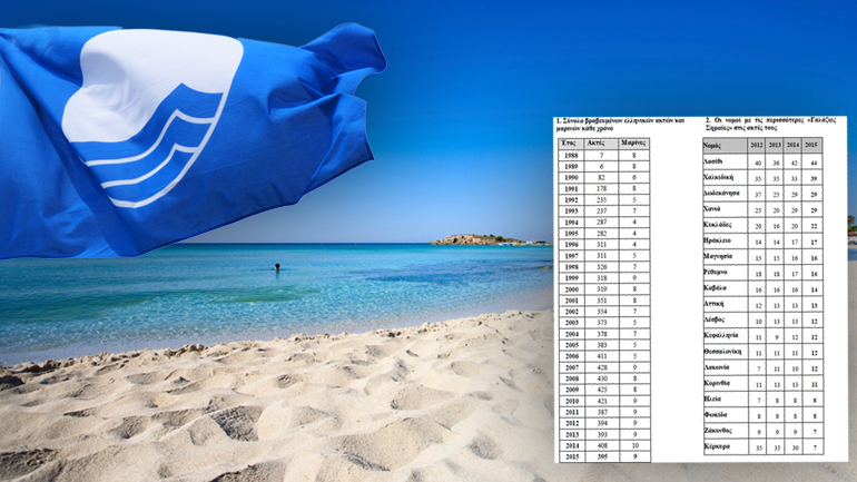 Τριακόσιες ενενήντα πέντε ελληνικές ακτές και εννέα μαρίνες κέρδισαν, φέτος, το διεθνές βραβείο ποιότητας «Γαλάζιες σημαίες», τοποθετώντας την Ελλάδα στην 3η θέση παγκοσμίως ανάμεσα σε 50 χώρες, σύμφωνα με την Ελληνική Εταιρία Προστασίας της Φύσης (ΕΕΠΦ).
