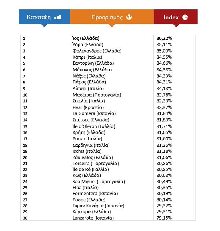 Είναι χαρακτηριστικό ότι στις 7 από τις 8 πρώτες θέσεις της λίστας με τα 30 δημοφιλέστερα νησιά της Μεσογείου βρίσκονται ελληνικοί προορισμοί με την Ίο να καταλαμβάνει την πρώτη θέση με ποσοστό δημοτικότητας 86,22%, ακολουθούμενη από την Ύδρα. Άρωμα Κυκλάδων έχει η τρίτη θέση, η οποία καταλαμβάνεται από την Φολέγανδρο.