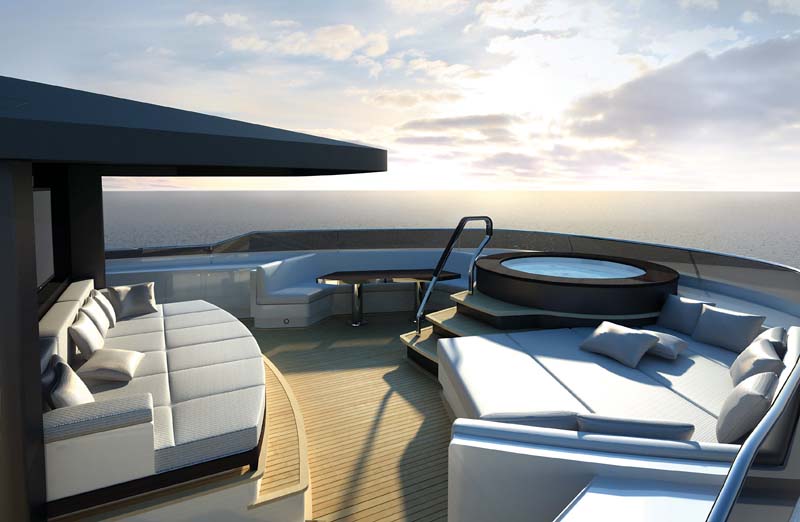 Στο κατώτερο κατάστρωμα βρίσκεται μια master σουίτα, μια VIP και τέσσερις ακόμα, εκτός φυσικά αυτές του πληρώματος. Στην πρύμνη είναι μια μεγάλη πισίνα, η οποία έχει την μοναδική ικανότητα να μετατρέπεται σε ελικοδρόμιο, με τους χώρους για μικρά φουσκωτά και τα jet-ski να είναι επίσης κρυφοί, ώστε να μην «χαλάνε» την εικόνα του σκάφους.