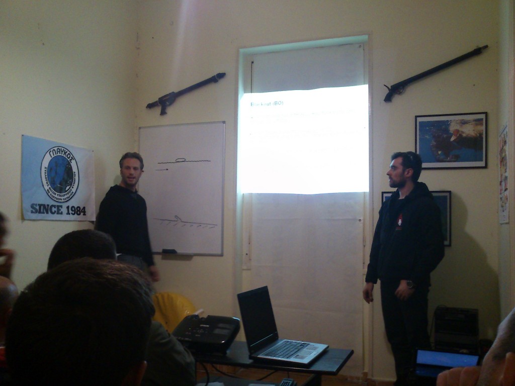 Σ’ αυτό αναλύθηκε η τεχνική της ελεύθερης κατάδυσης, η φυσιολογία των καταδύσεων, οι αναπνοές, το black out, και θέματα που αφορούν στην ασφάλεια, στα οποία δόθηκε ιδιαίτερη έμφαση. Στα μέσα του θεωρητικού μέρους έγινε κλήρωση μεταξύ των παρευρισκομένων για 2 σχολεία ελεύθερης κατάδυσης με 50% έκπτωση στα δίδακτρα, προσφορά του ομιλητή, ενώ στο τέλος έγινε προβολή βίντεο με πραγματικά περιστατικά υποξίας και samba, εξηγώντας τα σημάδια που θα πρέπει να προσέξει κάποιος στο ζευγάρι του κατά και μετά την ανάδυση.