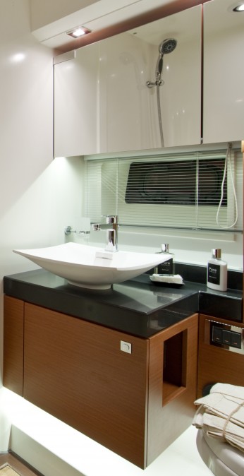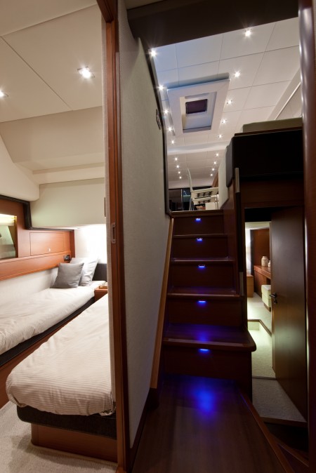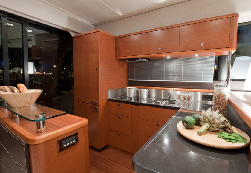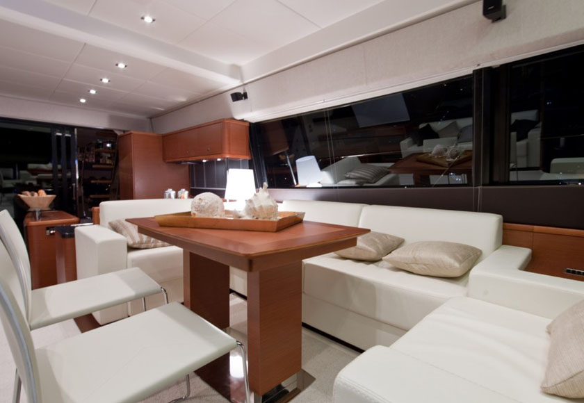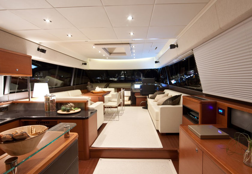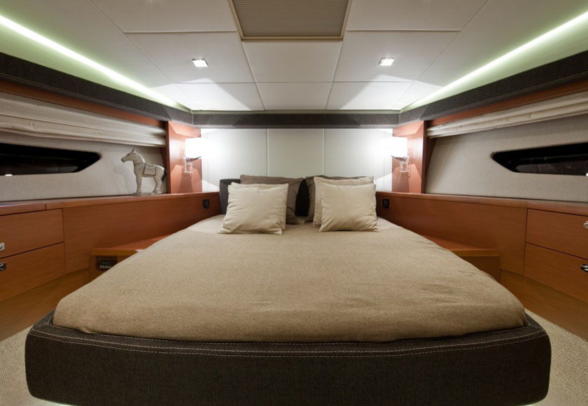 Στο εσωτερικό μπορούν να φιλοξενηθούν με άνεση περισσότερα από έξι άτομα, διαθέτοντας τρεις μεγάλες καμπίνες, εκτός από αυτές του πληρώματος. Φυσικά, δεν θα μπορούσαν να λείπουν οι καναπέδες, η τραπεζαρία, η κουζίνα και τα μπάνια, με τον συνδυασμό ξύλου και δερμάτινων επενδύσεων να αναδεικνύει την πολυτέλεια των χώρων.