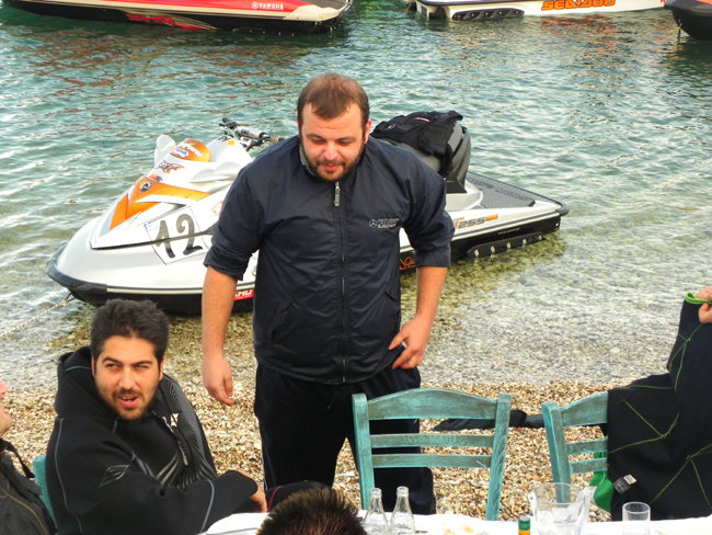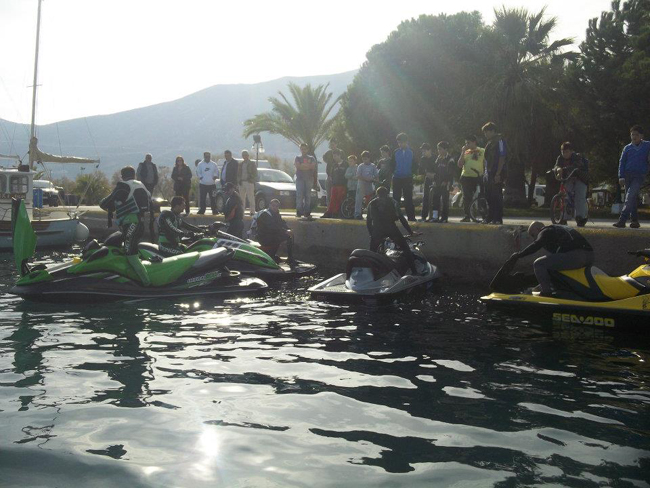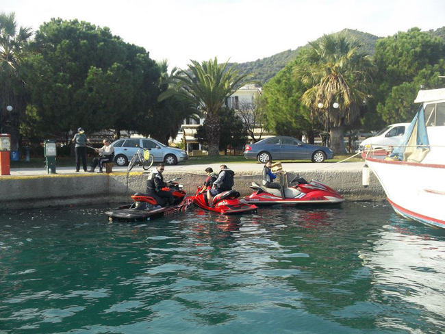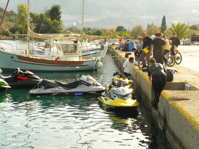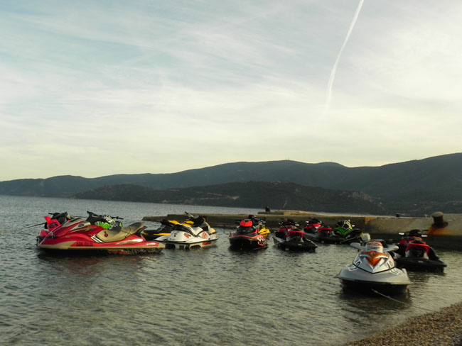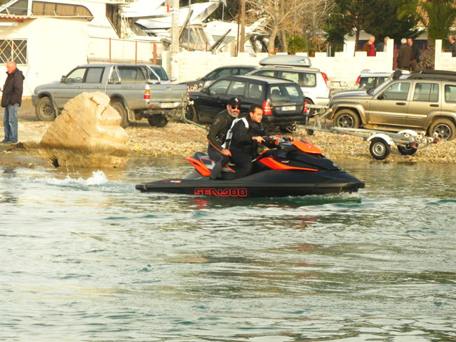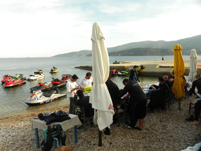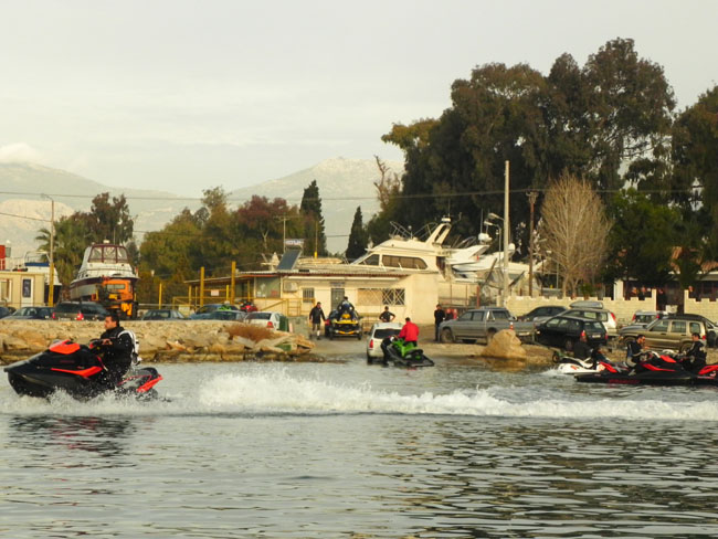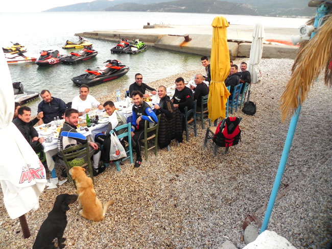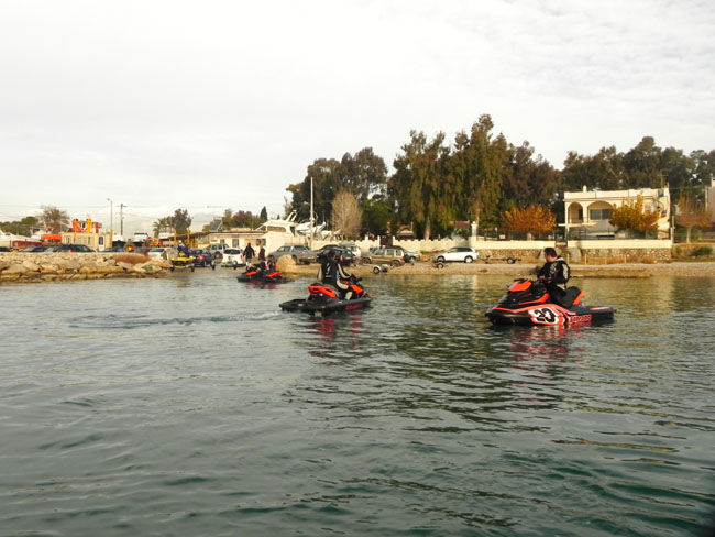 Η παρέα, ξεκίνησε το ταξίδι στις 12 το μεσημέρι (το ραντεβού ήταν για τις 9 το πρωί) και όπως μπορείτε να φανταστείτε δεν χρειάστηκε και πολύ ώρα για να… δέσουν τα «σκάφη» στο λιμάνι της Παλαιάς Επιδαύρου που ξαφνικά, εκείνη την χειμερινή όμορφη μέρα, γέμισε από ζωή. Οι Jetάδες (έτσι αποκαλούνται οι φίλοι του Jet Ski) έκαναν την πρώτη στάση για καφέ, είπαν τα ανέκδοτα τους, γέλασαν, πείραξε ο ένας τον άλλο και μετά από 1-2 ώρες συνέχισαν το ταξίδι τους. Παραλία, παραλία, και με πολύ παιχνίδι στην πορεία έφτασαν στο Λουτρά Ωραίας Ελένης. Τα Jet ski «πάρκαραν» σχεδόν πάνω στο κύμα, εκεί όπου κάθισαν για να γευματίσουν οι… εκδρομείς καθώς ο ταβερνιάρης δημιούργησε ένα μοναδικό σκηνικό με καθίσματα και καρέκλες πάνω στα βότσαλα!!!