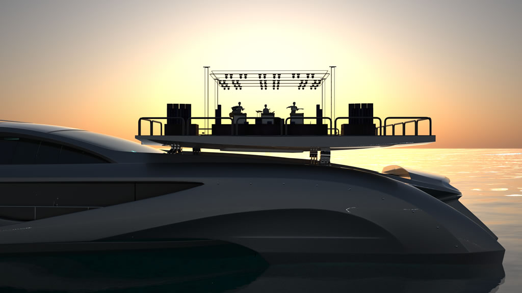 Το εξωτερικό σαλόνι με την πισίνα και τους λευκούς καναπέδες είναι ιδανικό για χαλάρωση, η πίσω πλατφόρμα περιβάλλεται από ειδικό γυαλί, παρέχοντας προστασία από τα αδιάκριτα βλέμματα. Το ελικοδρόμιο μπορεί να μεταμορφωθεί σε σκηνή για εκδηλώσεις και κονσέρτα, με το φωτισμό όλου του σκάφους να αλλάζει ανάλογα την περίσταση.