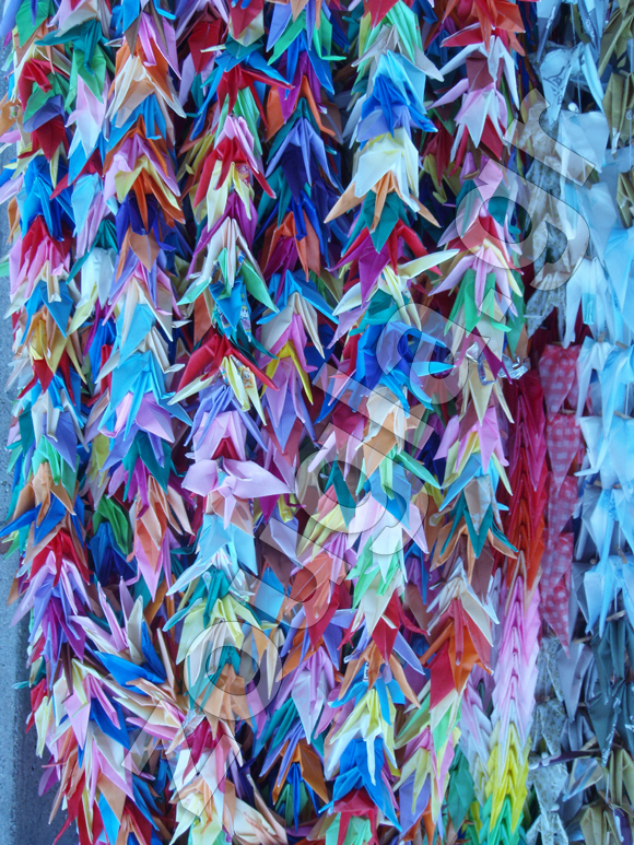 Βγαίνοντας, βλέπεις τους χάρτινους πολύχρωμους γερανούς, που κατασκευάζουν οι μαθητές των σχολείων, με τη μέθοδο του origami, της χαρτοδιπλωτικής.