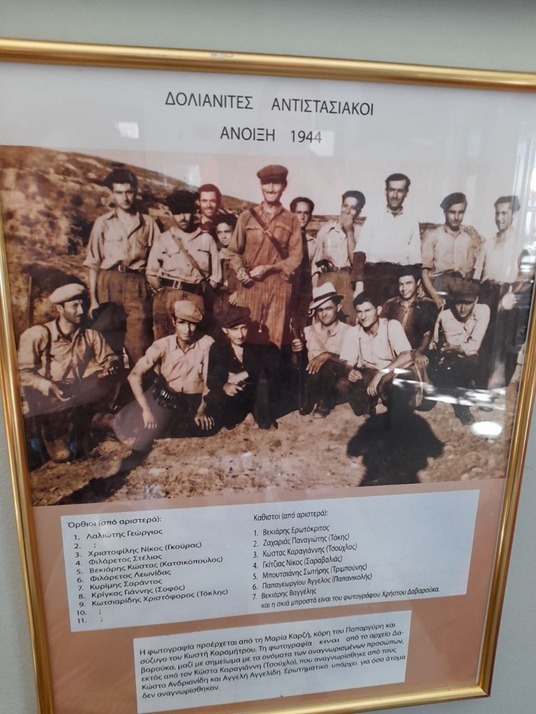 Δεσπόζει η αναμνηστική με τους 17 αντιστασιακούς, όπως τους απαθανάτισε ο φωτογράφος του χωριού το 1944. Σχεδόν για όλους -δηλαδή όσους δεν χάθηκαν στον Εμφύλιο από φίλια πυρά ή την λύσσα του καθεστώτος σε εκείνες τις μέρες εκκαθαρίσεων- υπάρχει μια γενναία, αλλά πικρή ιστορία.