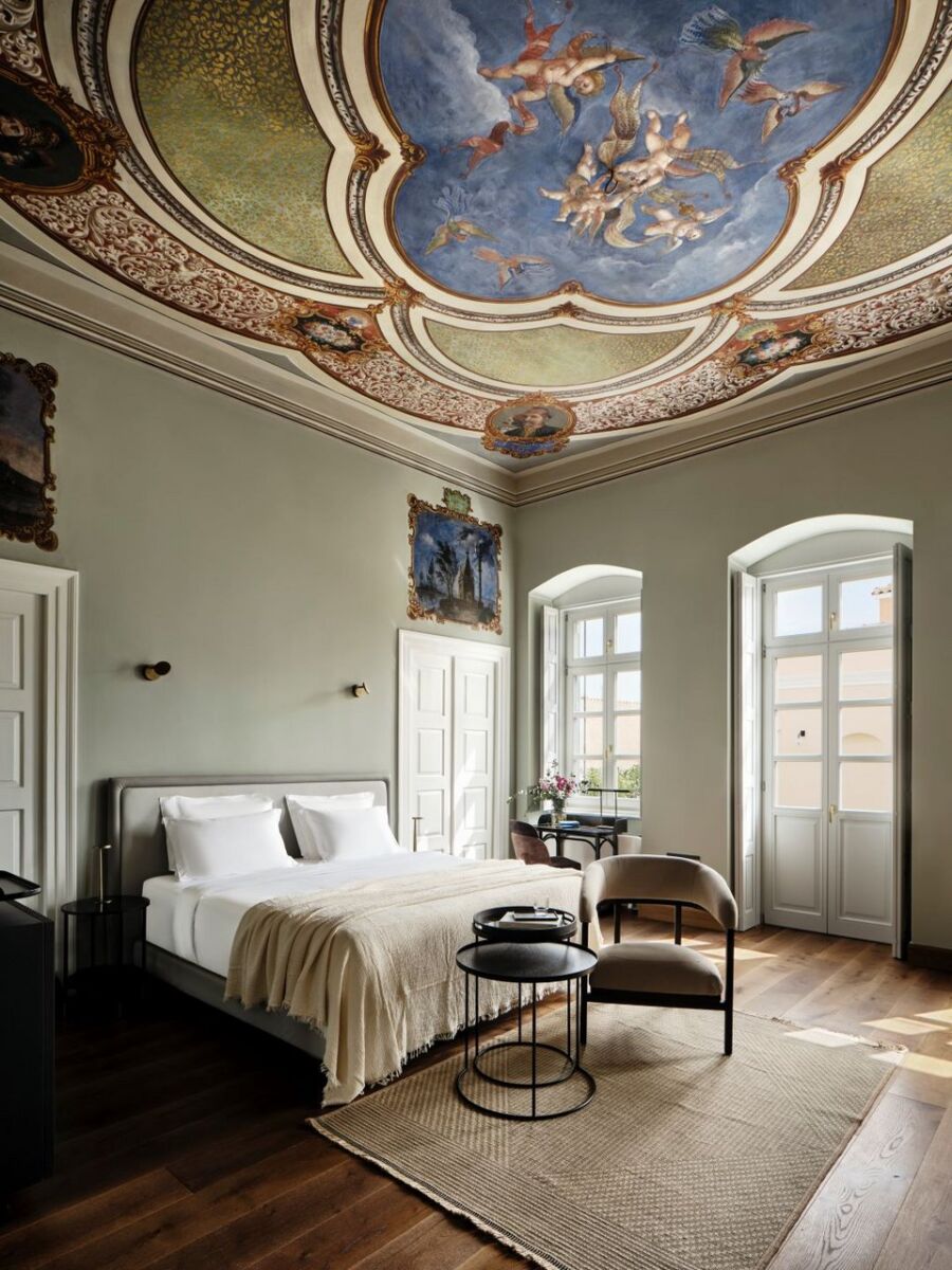 Οι ιστορικές μνήμες εναρμονίζονται πλήρως με σύγχρονες αναφορές design από διεθνείς οίκους όπως Gessi, Flos, Artemide, Panzeri, TOOY, ΑSTRO, Poltrona Frau, Buster + Punch συντελώντας σε ένα σύνθετο δημιούργημα αρχοντικής φιλοξενίας. Αισθητική και λειτουργικότητα βρίσκουν πρόσφορο έδαφος σε μια bespoke προσέγγιση interior design που τοποθετεί το μάρμαρο σε πρωταγωνιστικό ρόλο. Μάρμαρα όπως Covelano Macchia Vecchia, Azul Cielo, λευκά μάρμαρα Διονύσου και Grigio Carnico μεταξύ πολλών άλλων, συμπληρώνουν αρμονικά, ως φυσική συνέχεια, την διακόσμηση των δωματίων.
