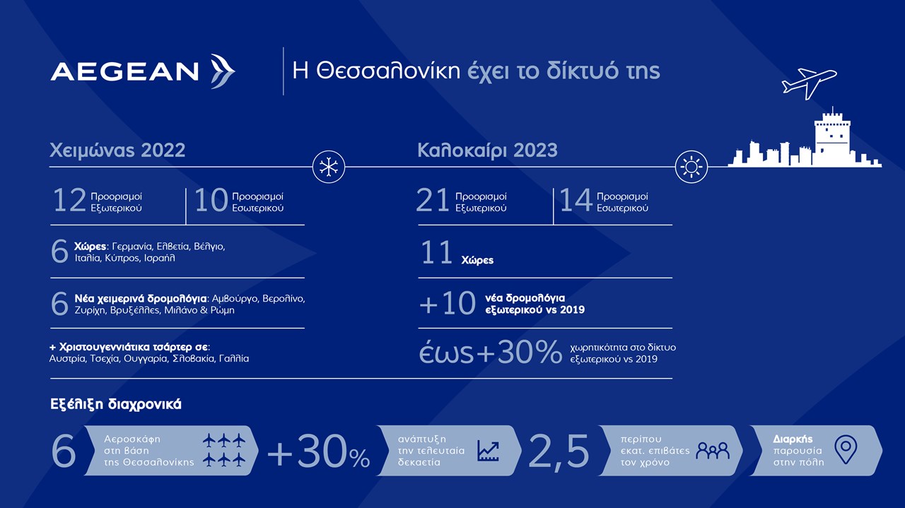 Η AEGEAN συνεχίζει να επενδύει στην πόλη με ενισχυμένο πρόγραμμα δρομολογίων τόσο κατά τη θερινή όσο και κατά τη χειμερινή περίοδο, αναδεικνύοντας το αεροδρόμιο «Μακεδονία» στον δεύτερο μεγαλύτερο κόμβο του δικτύου της, έχοντας μεταφέρει μέχρι αυτή τη στιγμή περισσότερους από 2 εκατ. επιβάτες. Με ένα διευρυμένο πρόγραμμα 19 δρομολογίων εξωτερικού κατά την περασμένη θερινή περίοδο, τα περισσότερα από τα οποία πλέον διατηρούνται όλο το χρόνο και 14 δρομολογίων εσωτερικού, η AEGEAN παρέχει στη Θεσσαλονίκη το δικό της δίκτυο και διασυνδέει την ευρύτερη περιοχή της Μακεδονίας με τις μεγαλύτερες πόλεις της Ευρώπης και της Ελλάδας. Μάλιστα, το φετινό χειμώνα διατηρώντας και τα 6 νέα επιπλέον διεθνή δρομολόγια προς το Αμβούργο, το Βερολίνο, τη Ζυρίχη, τις Βρυξέλλες, το Μιλάνο και τη Ρώμη, που εγκαινιάστηκαν το περασμένο καλοκαίρι, η AEGEAN μόνο το Νοέμβριο κατέγραψε αύξηση της δραστηριότητας της στο εξωτερικό κατά 25%, σε σχέση με τον Νοέμβριο του 2019. Ενώ με το νέο lounge, αλλά και τα υπερσύγχρονα αεροσκάφη της AIRBUS 320 και 321neo που επιχειρούν από το αεροδρόμιο «Μακεδονία» αναβαθμίζει την ταξιδιωτική εμπειρία, για το σύνολο των επισκεπτών της περιοχής.