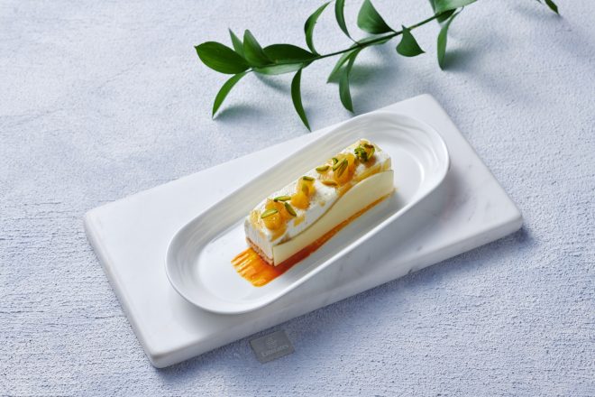 Για όσους επιβάτες επιθυμούν να απολαύσουν ένα επιδόρπιο, προσφέρεται κέικ με τροπική καρύδα και ανανά ή cheesecake σοκολάτας, συνοδευόμενο από γλυκό πουράκι μαύρης σοκολάτας και κομπόστα φράουλας.