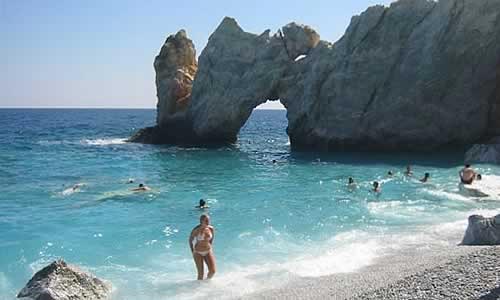 Οι πιο γνωστές παραλίες είναι οι Κουκουναριές, τα Λαλάρια, η Μπανάνα, ο Βρωμόλιμνος, η Καναπίτσα και η Μεγάλη Άμμος. Οι Κουκουναριές ή Μάραθα, που βρίσκονται στο νοτιοδυτικό τμήμα του νησιού είναι γνωστές, λόγω του ιδιαίτερου φυσικού κάλλους και της σπάνιας χλωρίδας και πανίδας. Στην περιοχή υπάρχει το περίφημο δάσος με τις κουκουναριές, το είδος του οποίου (Pinus pinea) είναι ιδιαίτερα σπάνιο και υπάρχει σε ελάχιστες περιοχές στον κόσμο. Το δάσος αποτελεί φυσικό εμπόδιο μεταξύ της λίμνης Στροφιλιάς και του Αιγαίου Πελάγους.