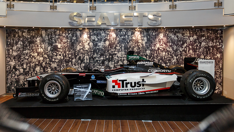 Στο κεντρικό αίθριο του πλοίου θα βρείτε ένα αυθεντικό μονοθέσιο της Formula 1, το οποίο έχει τρέξει στον κορυφαίο -παγκοσμίως- θεσμό του μηχανοκίνητου αθλητισμού. Μη χάσετε την ευκαιρία να φωτογραφηθείτε δίπλα του και να δείτε από κοντά μια γνήσια Minardi που οδηγούσε ο Jos Verstappen και η οποία θα συνοδεύει το «WorldChampion Jet» στα ταξίδια του.