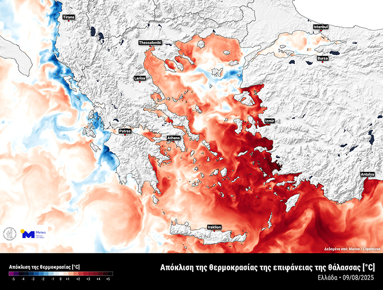 Η παρατεταμένη παρουσία ισχυρών ανέμων το τελευταίο διάστημα επηρεάζει, μεταξύ άλλων, και τη θερμοκρασία της επιφάνειας της θάλασσας. Στον χάρτη των αποκλίσεων της θερμοκρασίας στην επιφάνεια της θάλασσας σε σχέση με τις κλιματικές τιμές της αντίστοιχης περιόδου, διακρίνουμε αρχικά τα πολύ θερμά νερά στο νοτιοανατολικό Αιγαίο, μια περιοχή που δεν επηρεάζεται από τους ισχυρούς ανέμους.