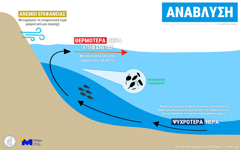 Εικόνα 2. Ο μηχανισμός της ανάβλυσης (upwelling) που παρατηρείται στις θαλάσσιες περιοχές κοντά στις ακτές. Πηγή δεδομένων: oceanservice.noaa.gov. Επεξεργασία & Οπτικοποίηση: meteo.gr.