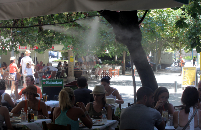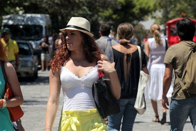 Με ομπρέλες, νερά και χυμούς προσπαθούν οι πολίτες να καταπολεμήσουν τις υψηλές θερμοκρασίες που επικρατούν στο κέντρο της Αθήνας.
