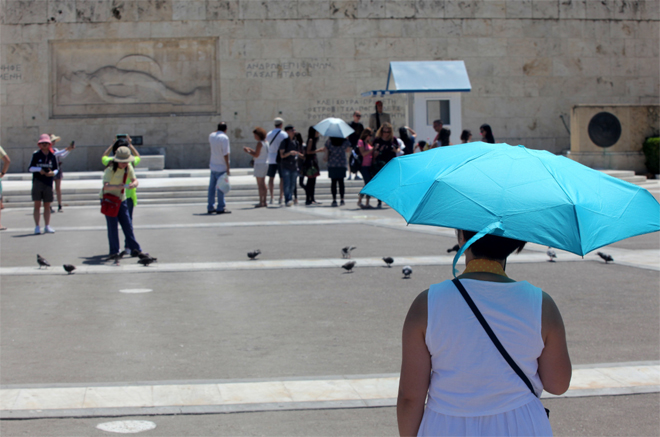 Με ομπρέλες, νερά και χυμούς προσπαθούν οι πολίτες να καταπολεμήσουν τις υψηλές θερμοκρασίες που επικρατούν στο κέντρο της Αθήνας.