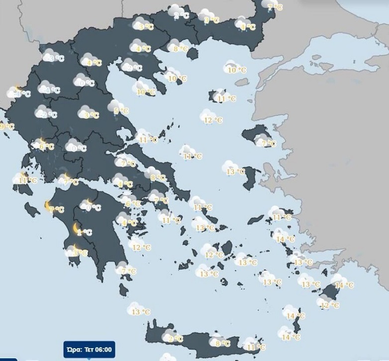 Η θερμοκρασία θα σημειώσει μικρή περαιτέρω πτώση, κυρίως στα βόρεια. Θα φτάσει στα βόρεια ηπειρωτικά τους 8 με 10 βαθμούς ενώ στα βορειοδυτικά (στο εσωτερικό της Ηπείρου και τη δυτική Μακεδονία) δεν θα ξεπεράσει τους 5 με 7 βαθμούς, στα δυτικά ηπειρωτικά και το Ιόνιο τους 14 με 15 βαθμούς, στα υπόλοιπα ηπειρωτικά τους 11 με 13 βαθμούς και στην ανατολική νησιωτική χώρα τους 15 με 16 βαθμούς Κελσίου.