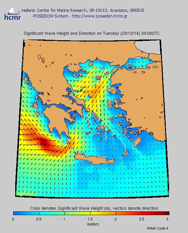 Οι άνεμοι στο βόρειο Αιγαίο θα πνέουν βόρειοι βορειοανατολικοί μέτριοι μέχρι ισχυροί, 5 με 6 μποφόρ, και τοπικά στα βορειοανατολικά πελάγη σχεδόν θυελλώδεις 7 μποφόρ. Στο νότιο Αιγαίο θα πνέουν από βόρειες διευθύνσεις μέτριοι, ενώ στα νοτιοδυτικά πελάγη θα επικρατήσουν ισχυροί έως σχεδόν θυελλώδεις βορειοανατολικοί άνεμοι εντάσεως 6 με 7 μποφόρ. Στο Ιόνιο οι άνεμοι θα πνέουν από ανατολικές διευθύνσεις ισχυροί έως σχεδόν θυελλώδεις, 6 με 7 μποφόρ, και κατά περιόδους τοπικά θυελλώδεις 8 μποφόρ.