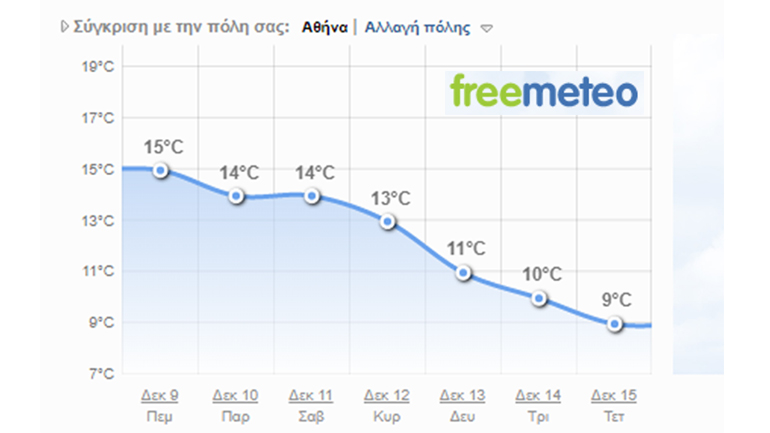 Σύμφωνα με τα διαγράμματα τα οποία επεξεργάστηκε η Μετεωρολογική Υπηρεσία, η πτώση της θερμοκρασίας από τη Δευτέρα θα είναι κάθετη και αισθητή σε όλη τη χώρα. Συγκεκριμένα, η κατώτερη θερμοκρασία στην Αττική θα αγγίξει τους 11 βαθμούς τη Δευτέρα, και έως την Τετάρτη η θερμοκρασία θα καθηλωθεί στους 10 βαθμούς Κελσίου. Αναλογική πτώση της θερμοκρασίας θα σημειωθεί σε όλες τις περιοχές της χώρας.